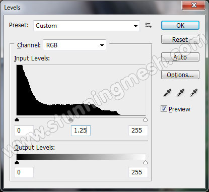 1. First of all we would be cleaning the skin by removing stains and wrinkles using some different and easy techniques. Run the command Image > Adjustment > Levels command or simply press Ctrl+L to open Level box and give the following settings: